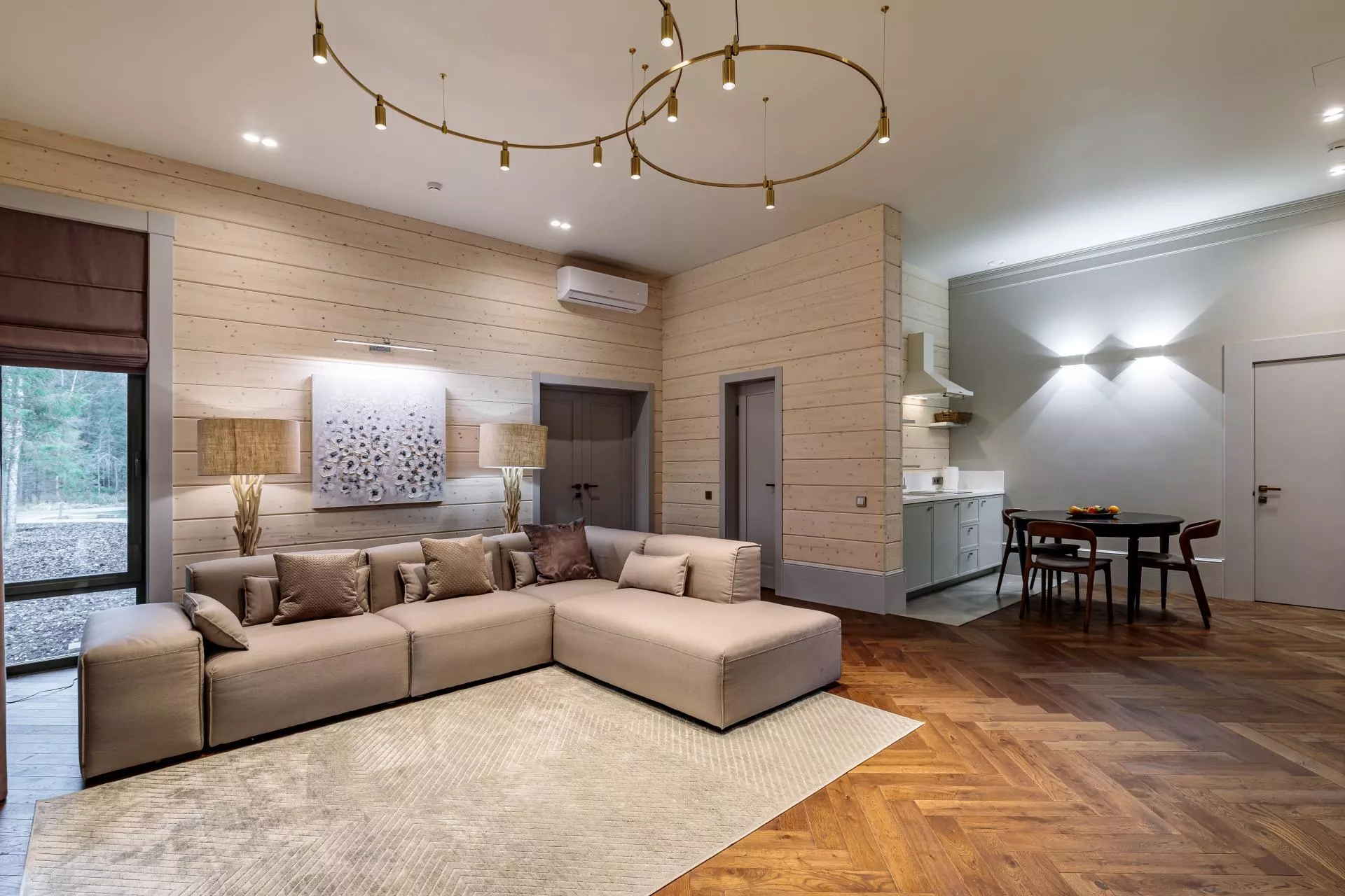 На первом этаже находится огромная по площади роскошная гостиная, оформленная в светлых тонах. Это пространство идеально подходит для общения, отдыха и оживленных игр. В дополнение к основной гостиной, вилла предлагает отдельную уютную гостиную, где можно уединиться с книгой или насладиться просмотром фильма.