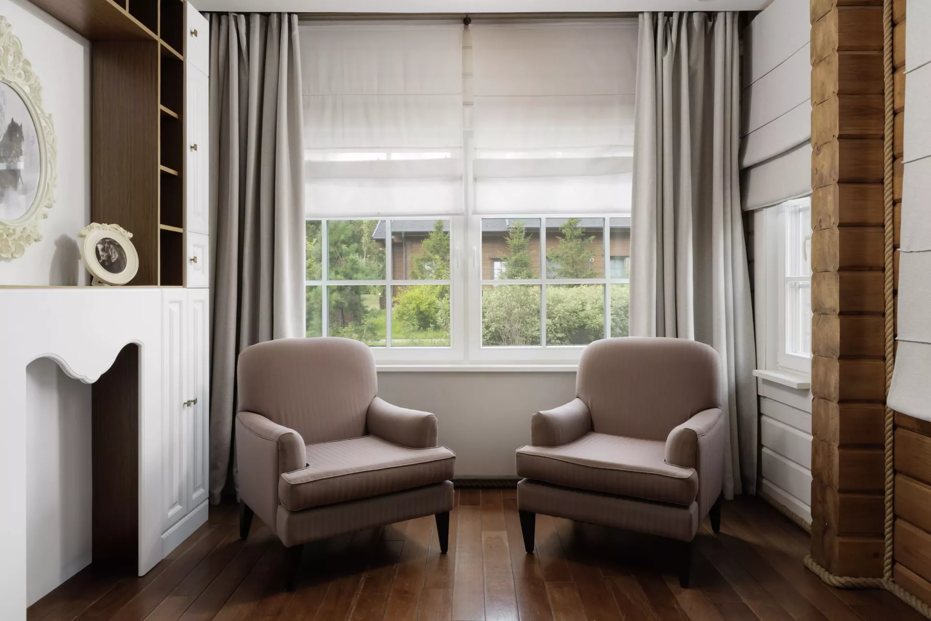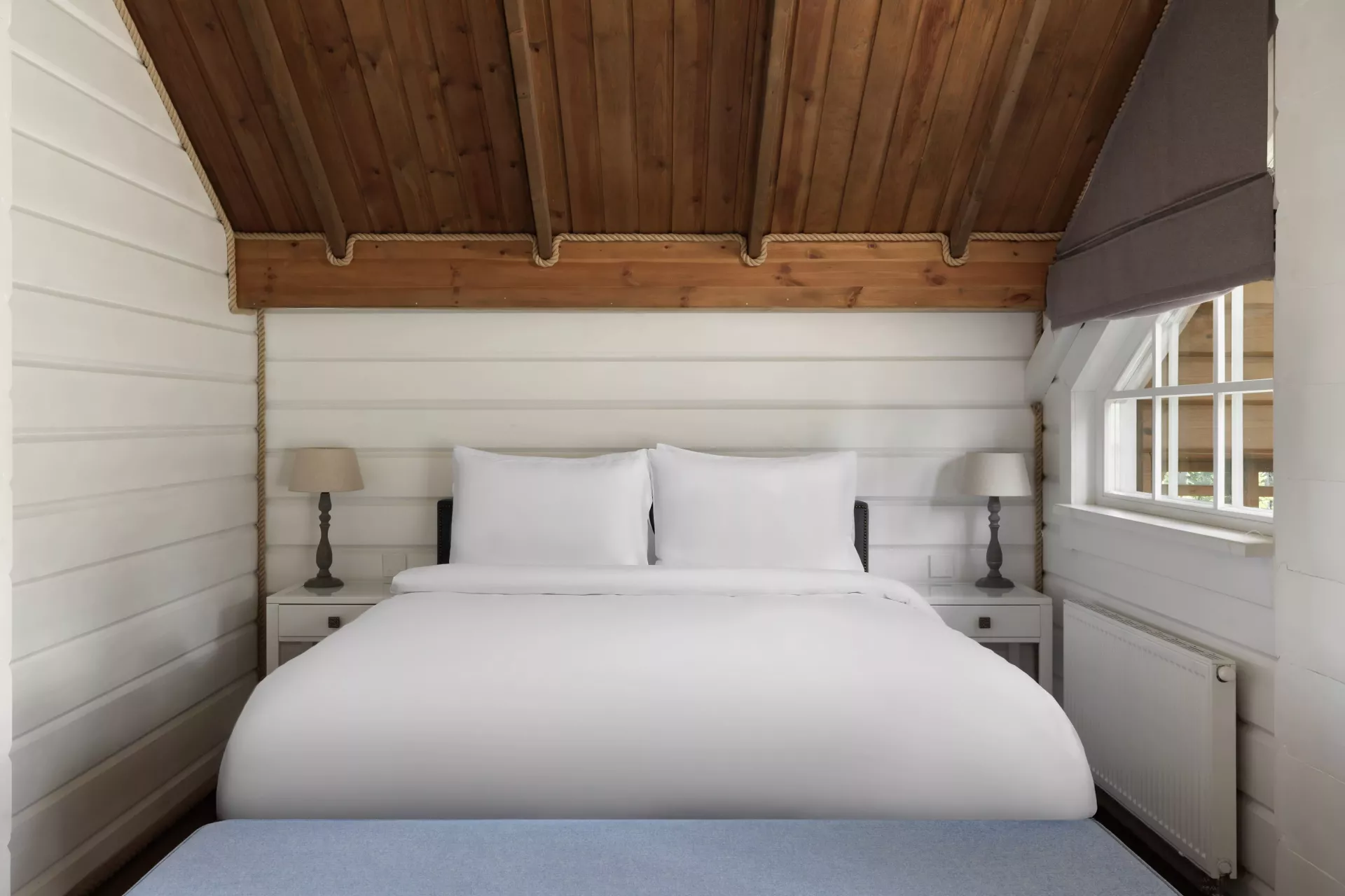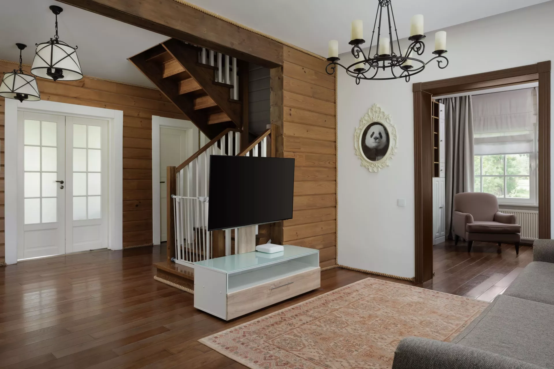 Одним из ключевых элементов пространства является деревянная лестница. Мебель из натурального дерева, текстиль в пастельной цветовой гамме и бронзовые светильники — деликатная роскошь для идеального отдыха на природе.