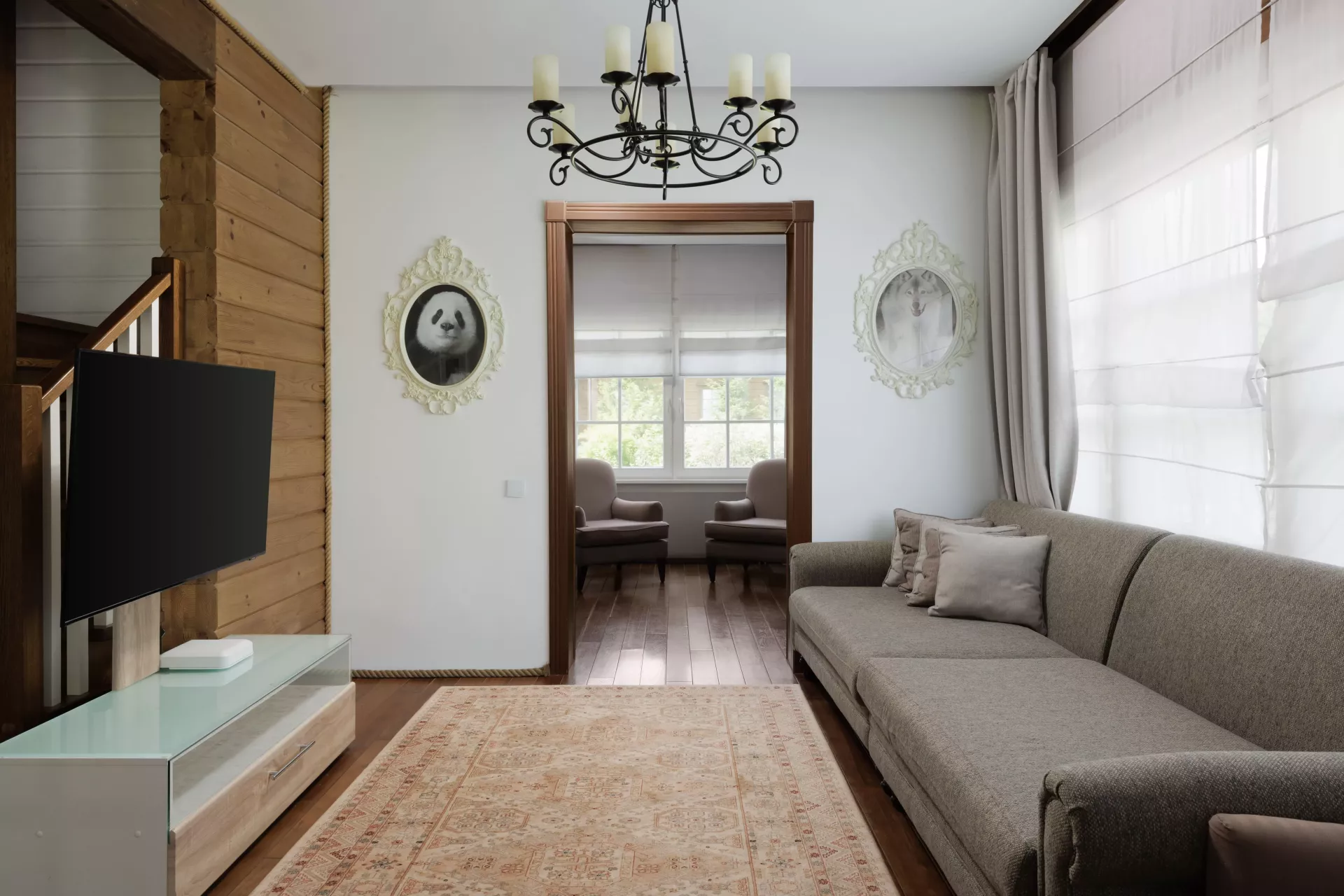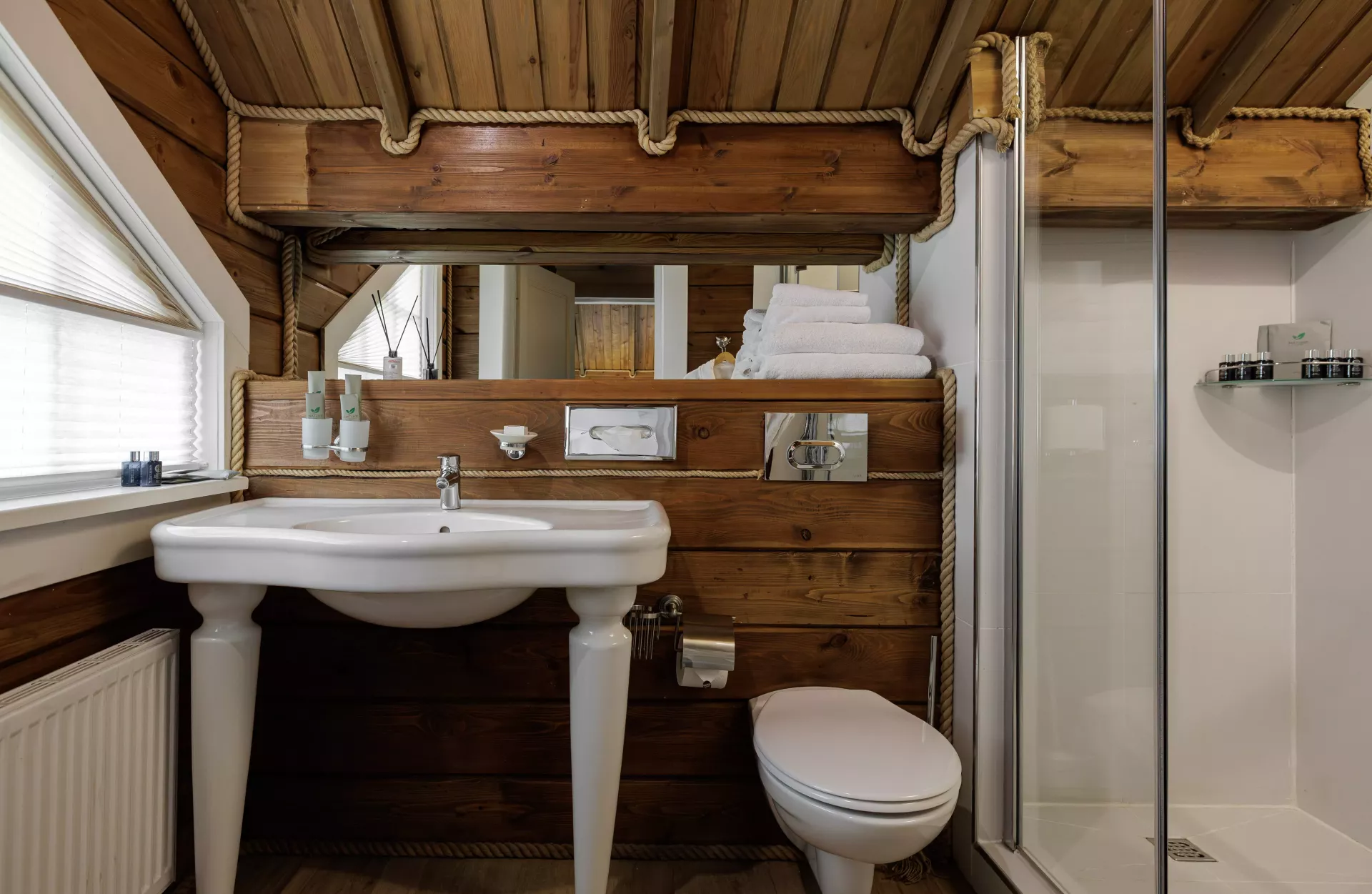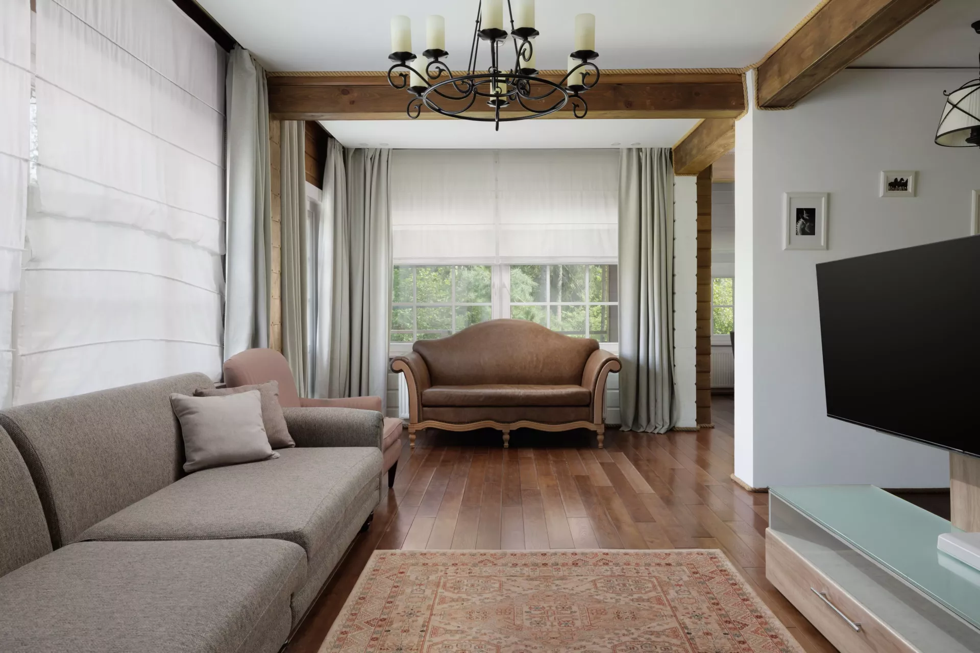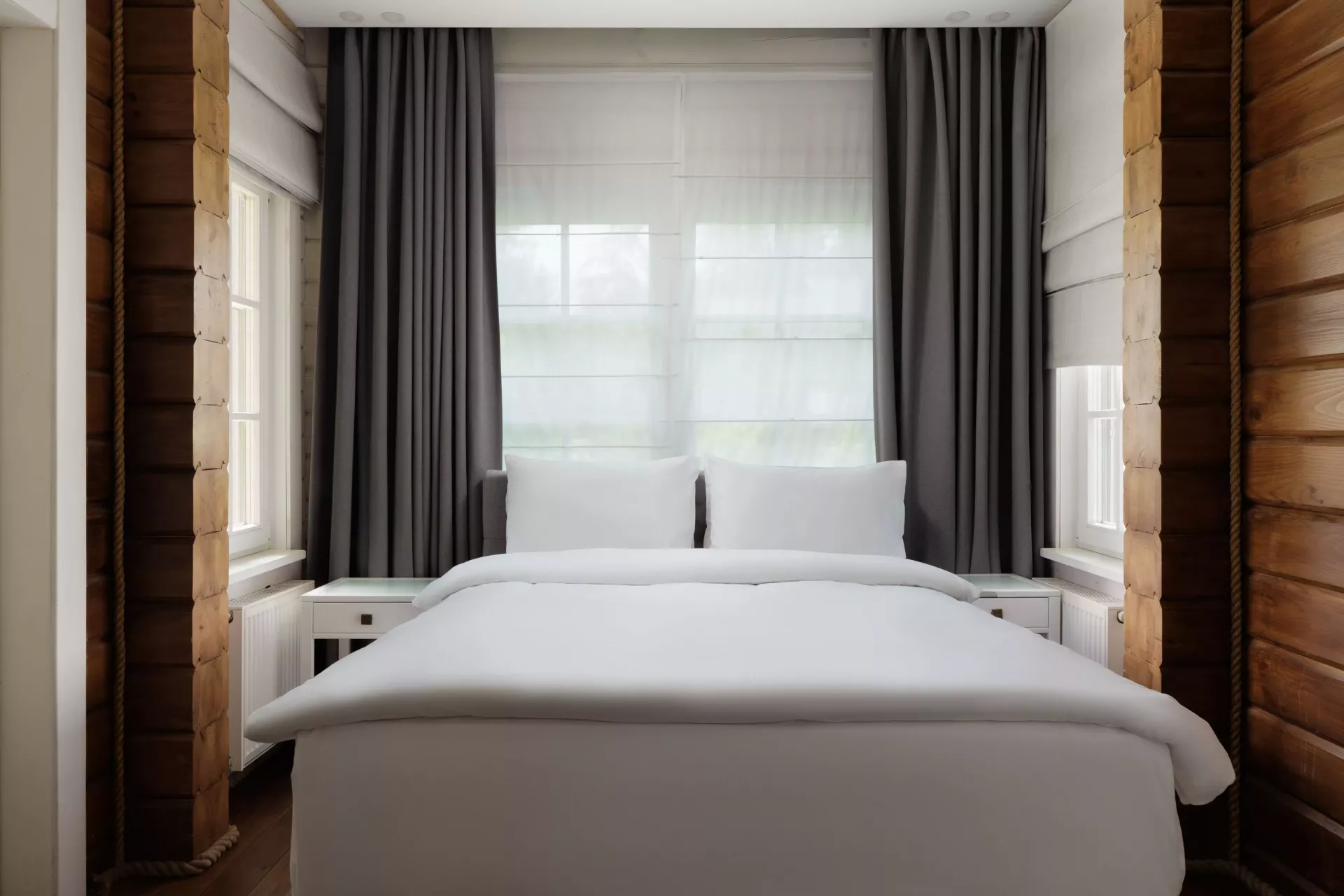 Одним из ключевых элементов пространства является деревянная лестница. Мебель из натурального дерева, текстиль в пастельной цветовой гамме и бронзовые светильники — деликатная роскошь для идеального отдыха на природе.