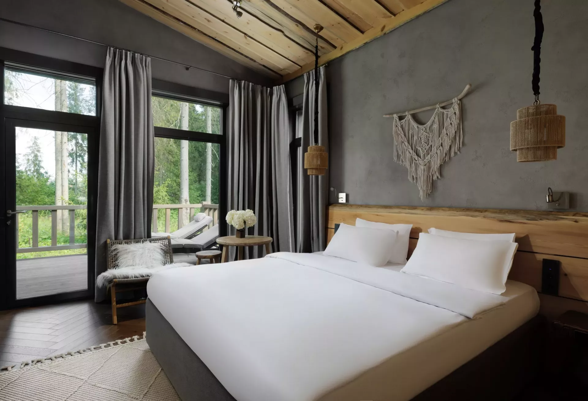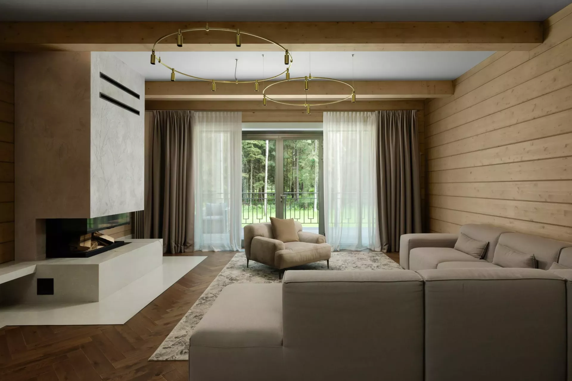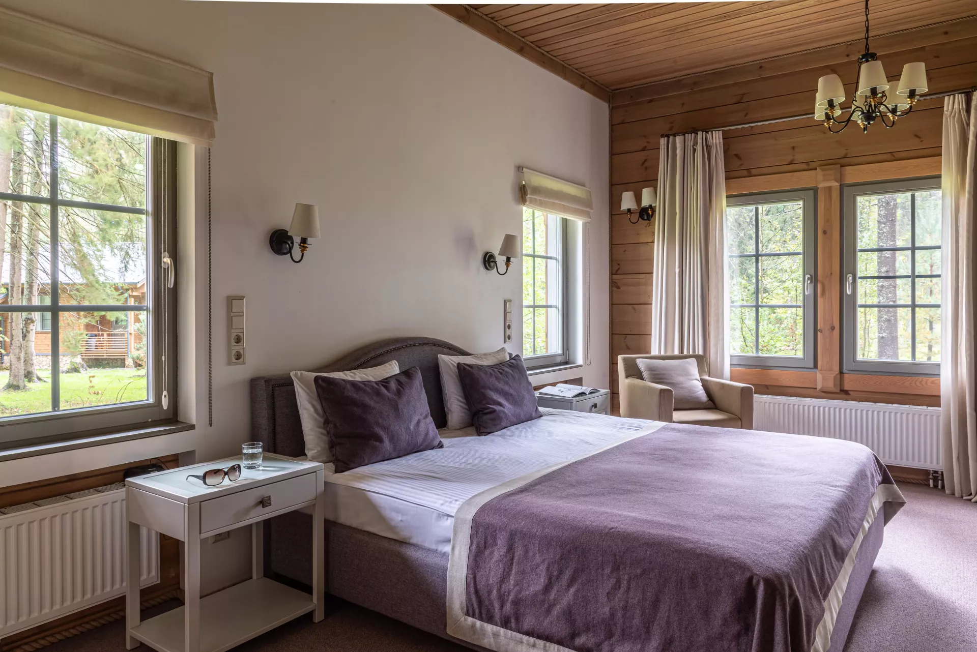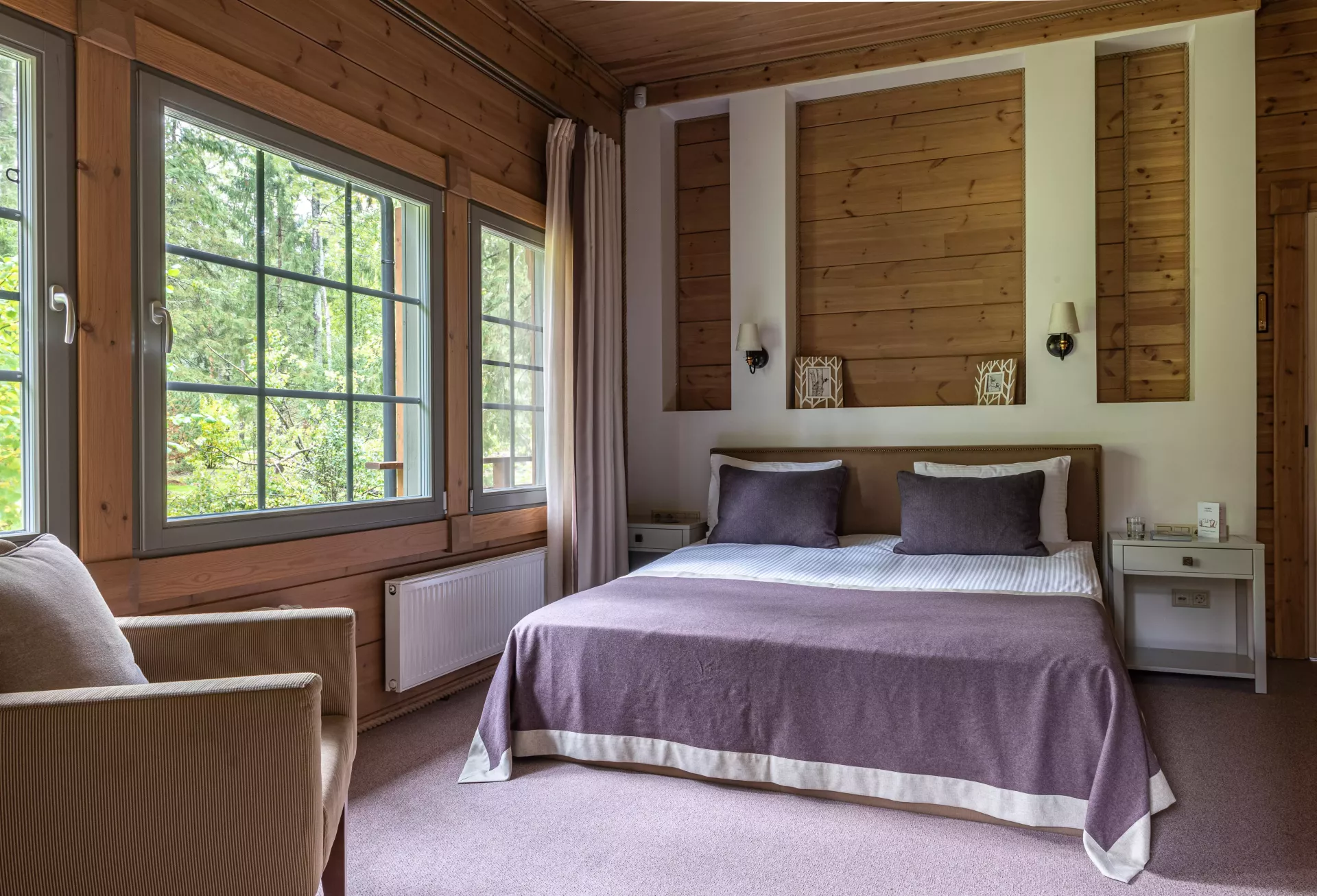 Простой и понятный дизайн, просторные и свободные пространства, а также преобладание светлых оттенков и натуральных текстур — умиротворяющая атмосфера уединенного отдыха в окружении природы. Большие окна наполняют пространство естественным светом и создают ощущение единения с лесным пейзажем.