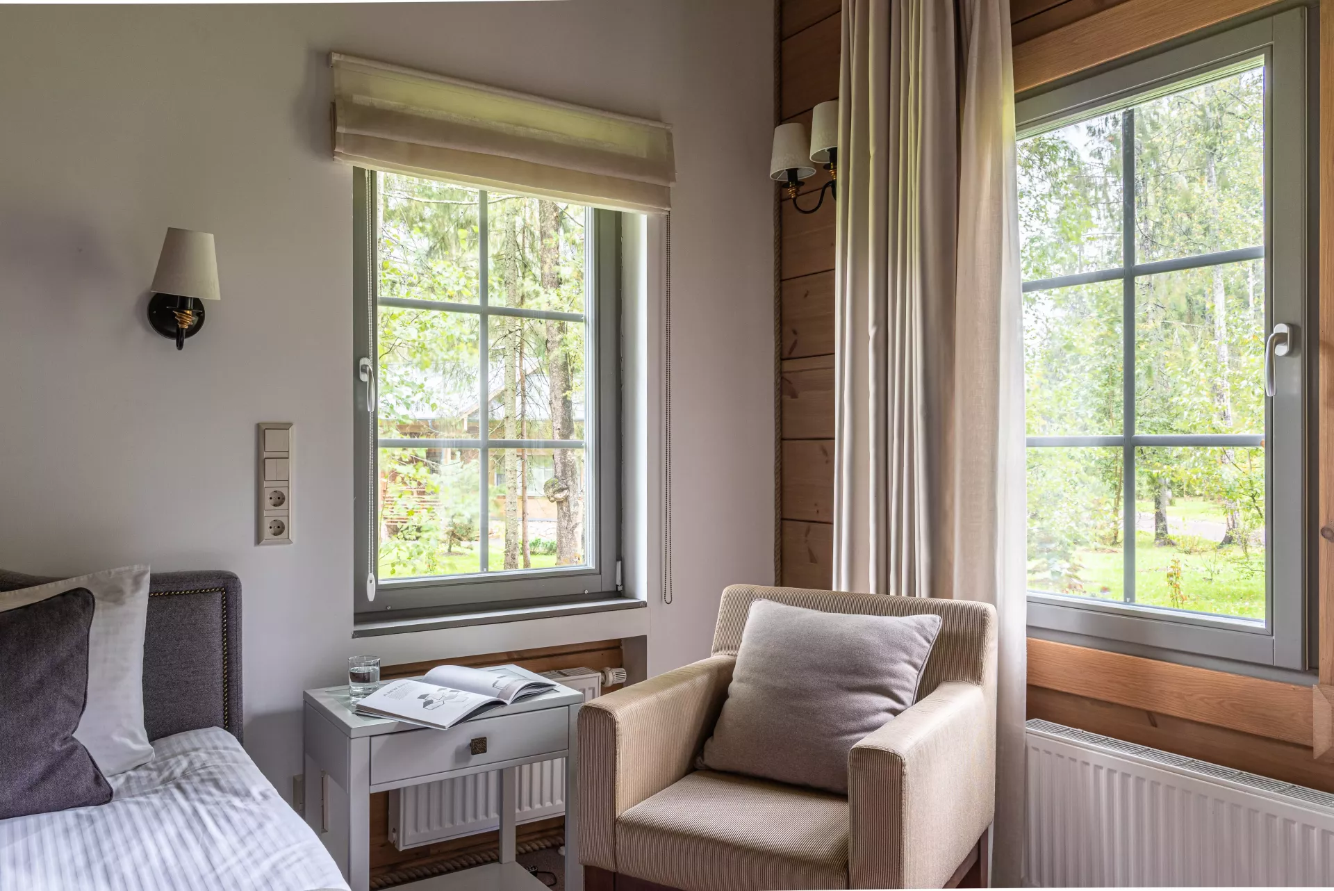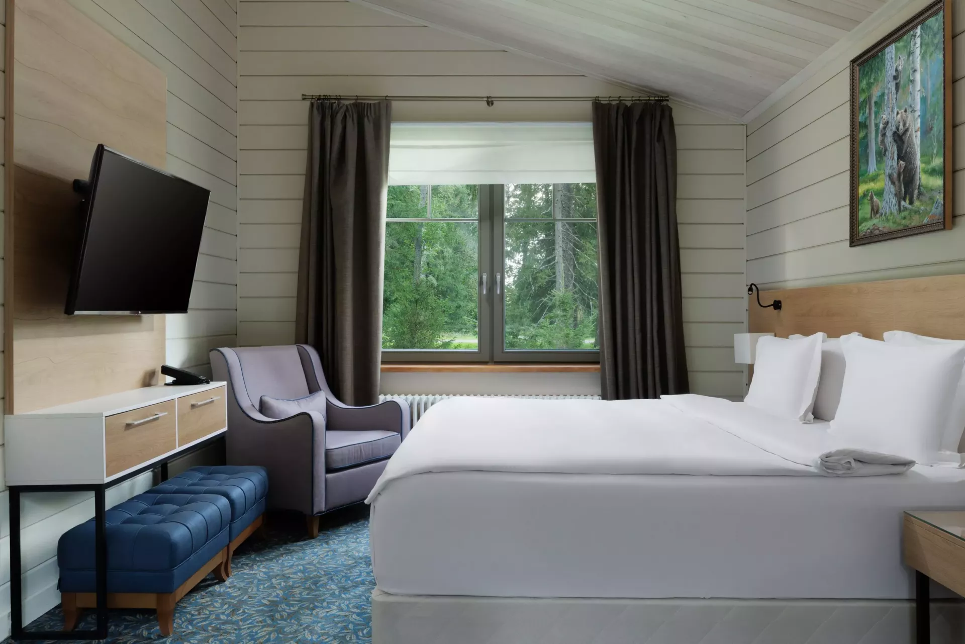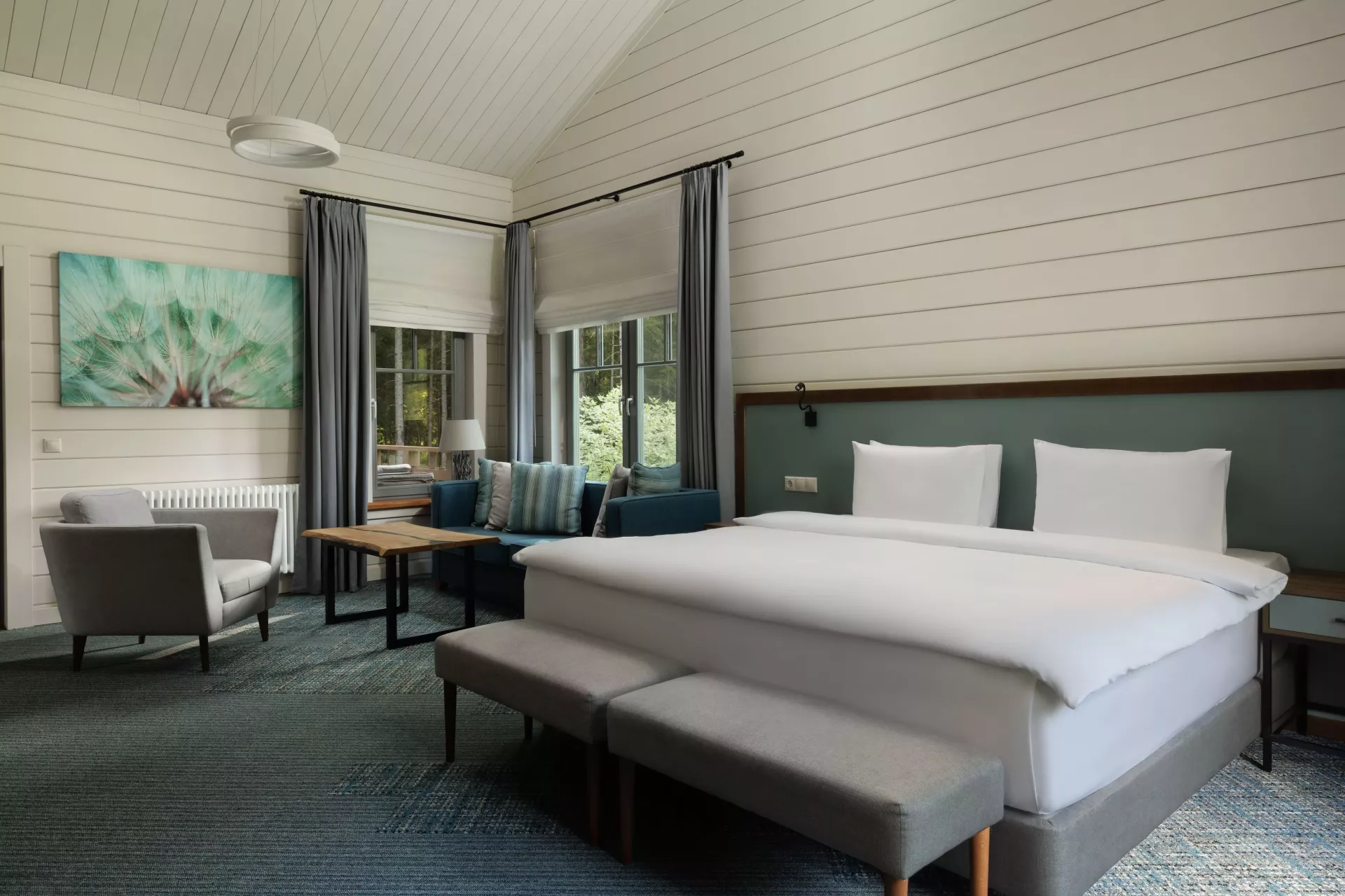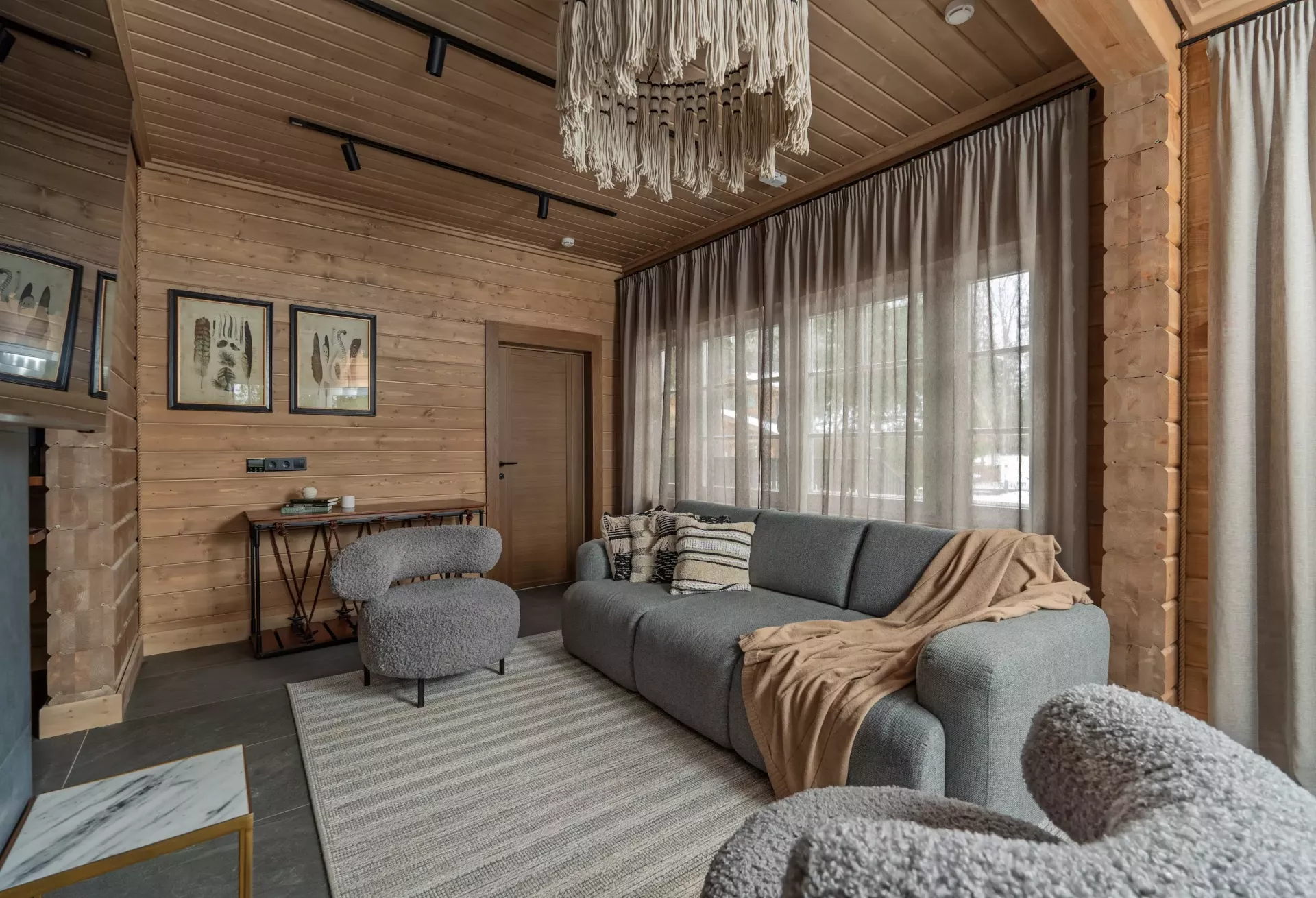 Простой и понятный дизайн, просторные и свободные пространства, а также преобладание светлых оттенков и натуральных текстур — умиротворяющая атмосфера уединенного отдыха в окружении природы. Большие окна наполняют пространство естественным светом и создают ощущение единения с лесным пейзажем.