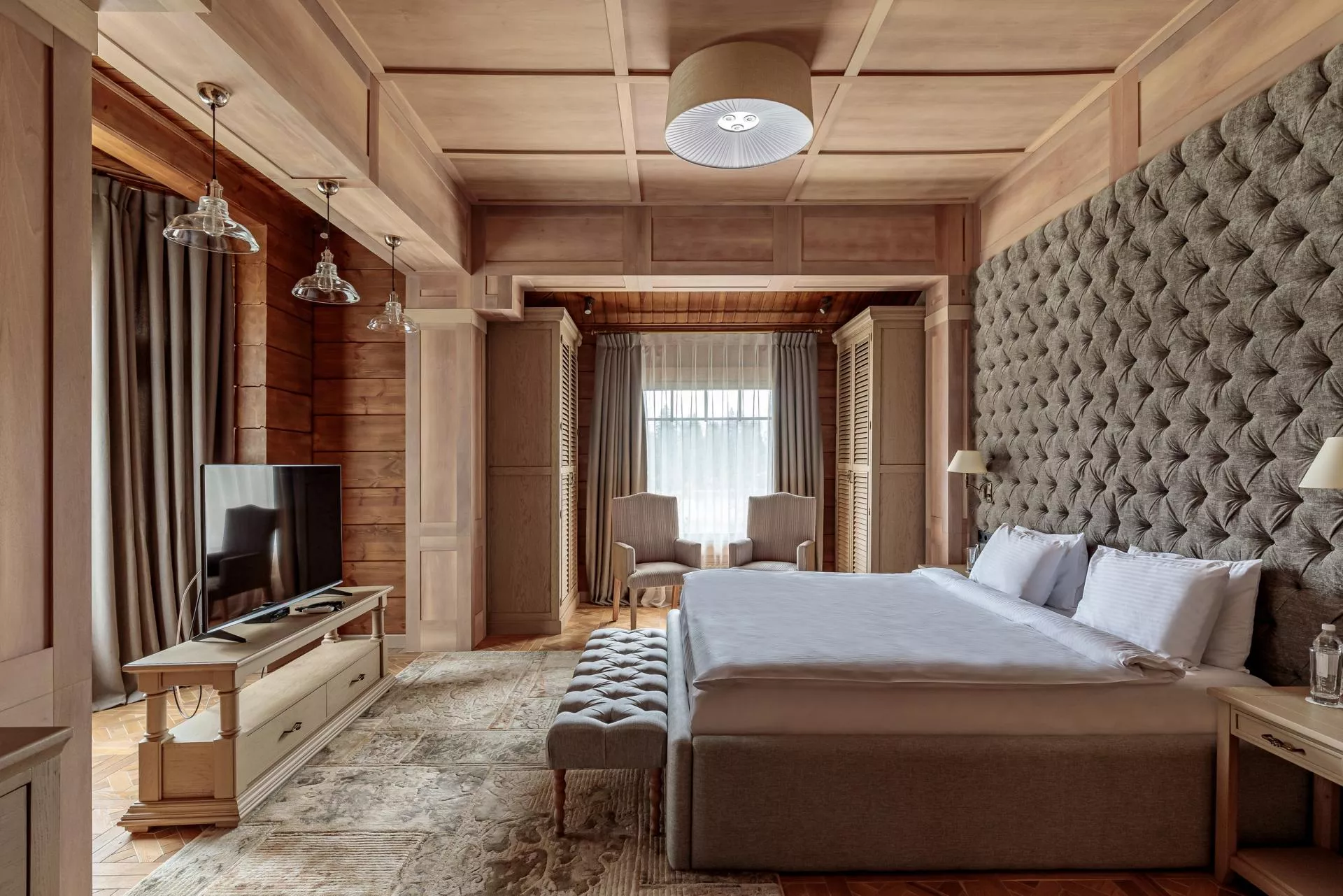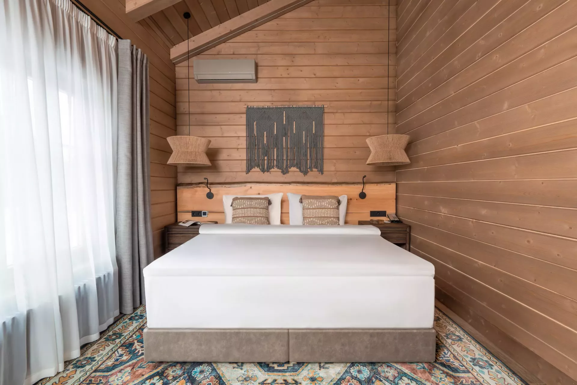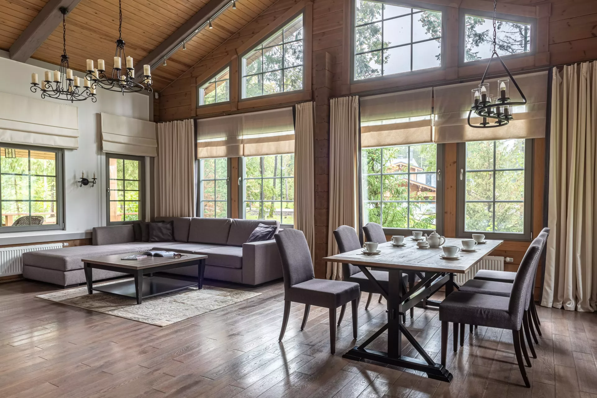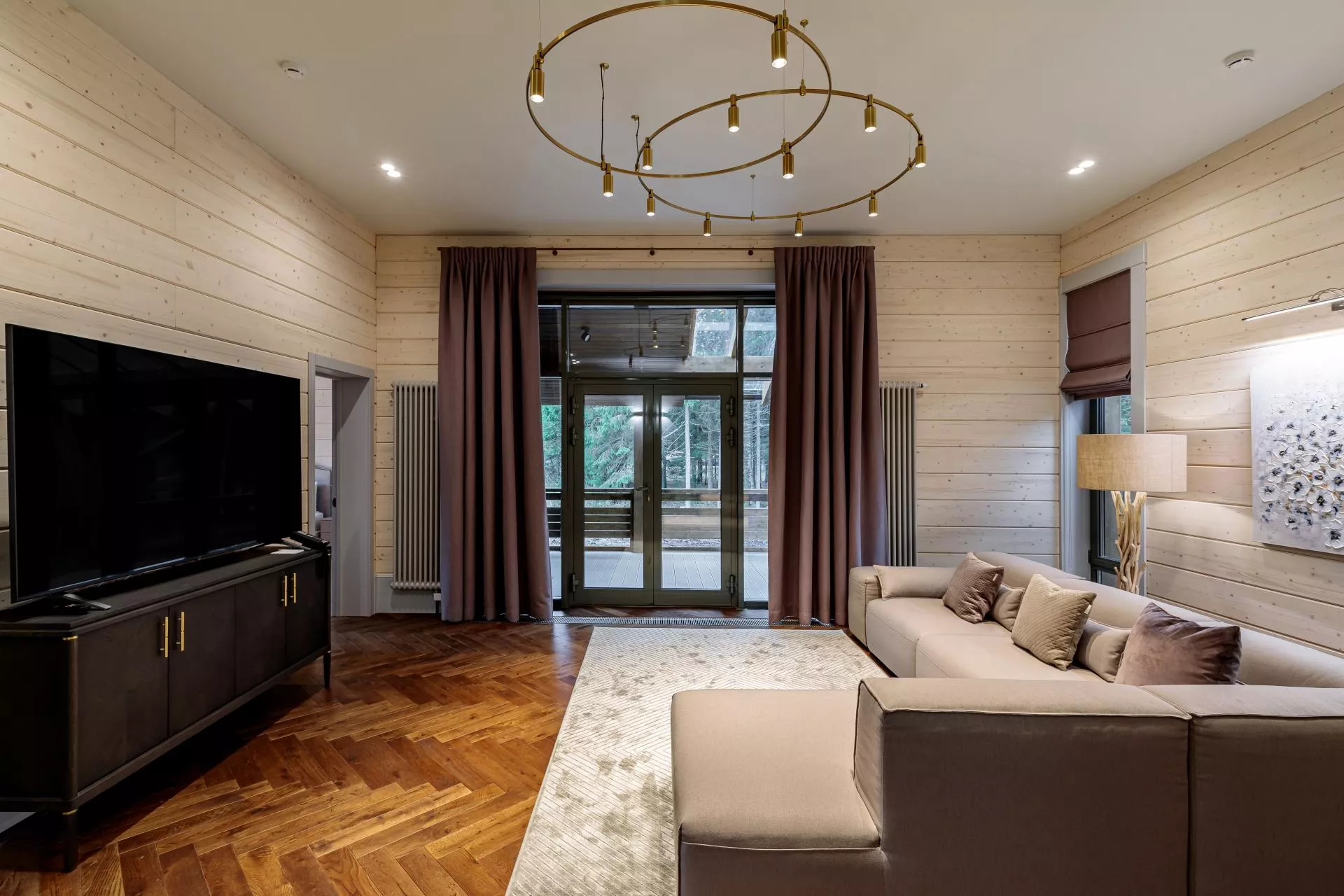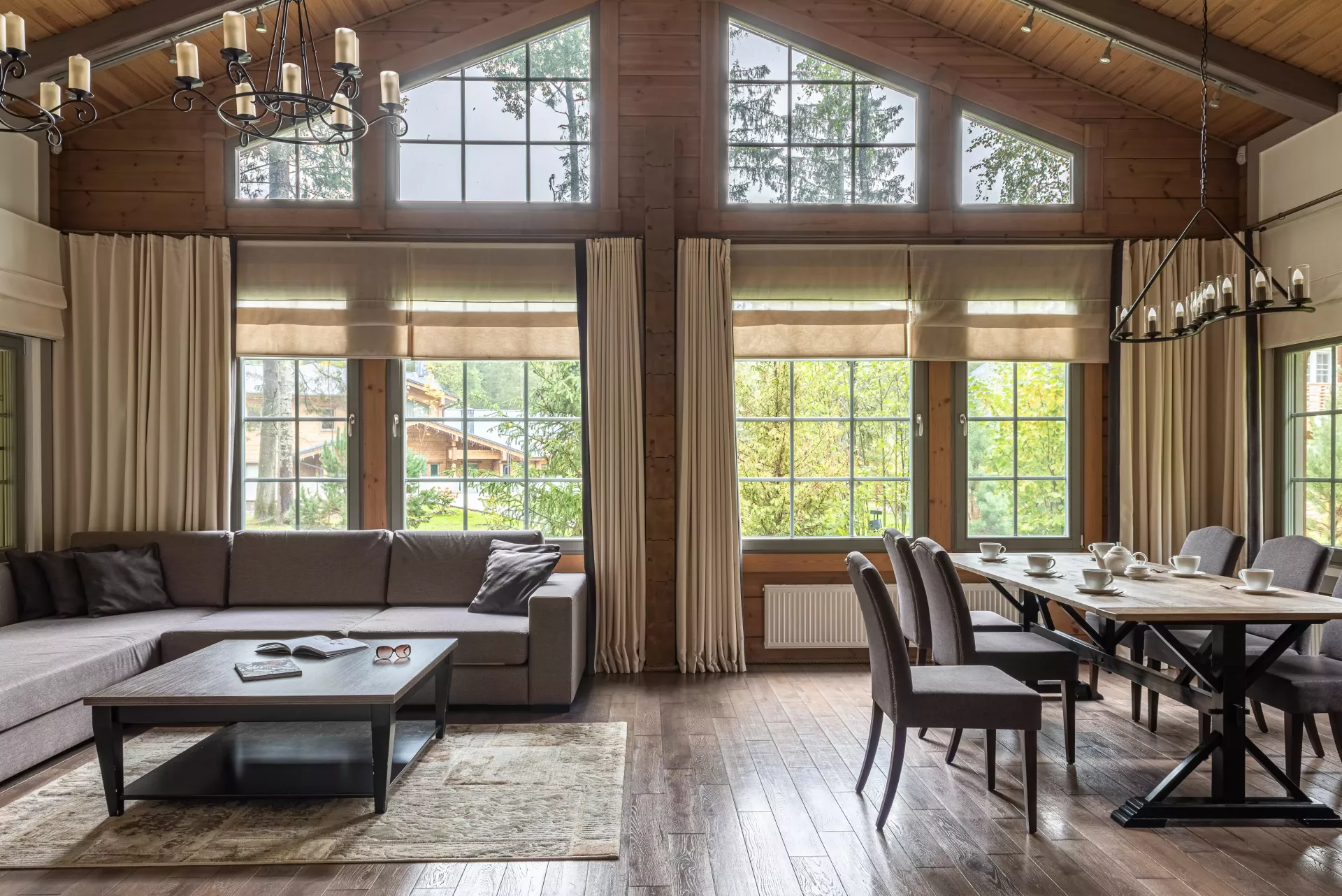 Простой и понятный дизайн, просторные и свободные пространства, а также преобладание светлых оттенков и натуральных текстур — умиротворяющая атмосфера уединенного отдыха в окружении природы. Большие окна наполняют пространство естественным светом и создают ощущение единения с лесным пейзажем.
