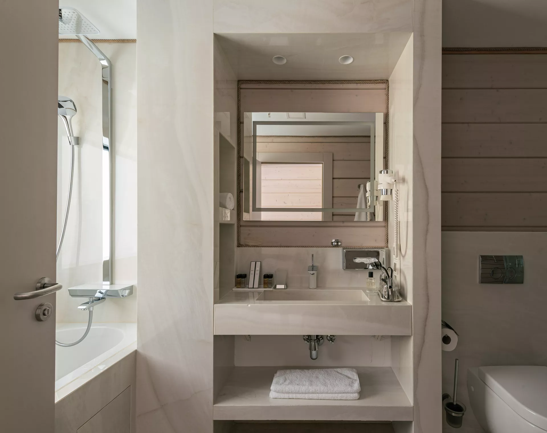 Просторный люкс площадью 103 м² создает идеальные условия для комфортного отдыха на выходных. Панорамные окна наполняют пространство естественным светом и открывают великолепные виды на окружающий лесной пейзаж. Две спальные зоны с кроватями из натурального дерева и мягким изголовьем, большая гостиная с удобными диванами, выход на уютную террасу — для тех, кто ценит стильный отдых в гармонии с природой.