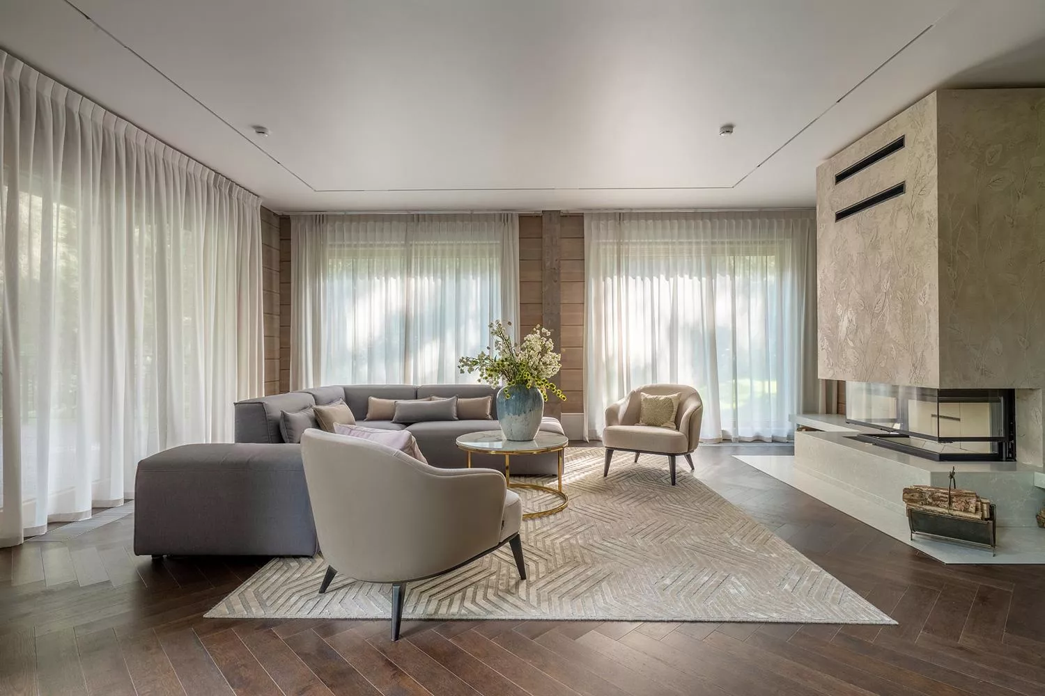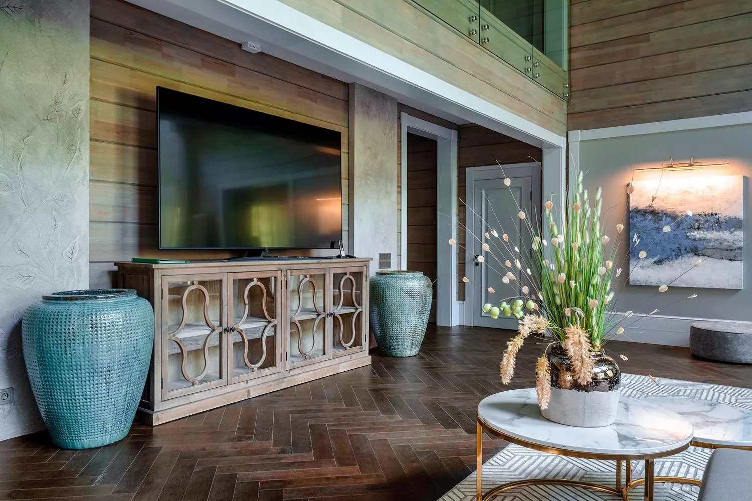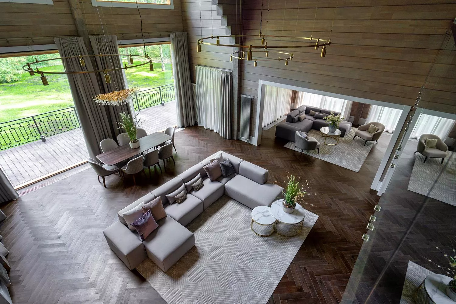На первом этаже находится огромная по площади роскошная гостиная, оформленная в светлых тонах. Это пространство идеально подходит для общения, отдыха и оживленных игр. В дополнение к основной гостиной, вилла предлагает отдельную уютную гостиную, где можно уединиться с книгой или насладиться просмотром фильма.