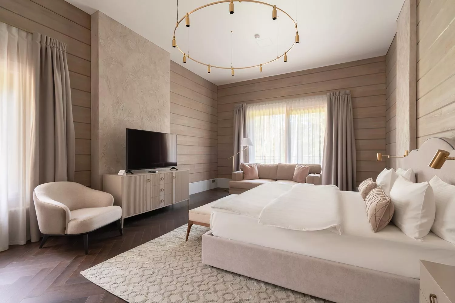 Вилла располагает шестью вместительными спальнями, расположенными на разных этажах: одна спальня на первом, четыре спальни на втором и одна на третьем этаже. Благодаря большим окнам в каждой из комнат много естественного света.