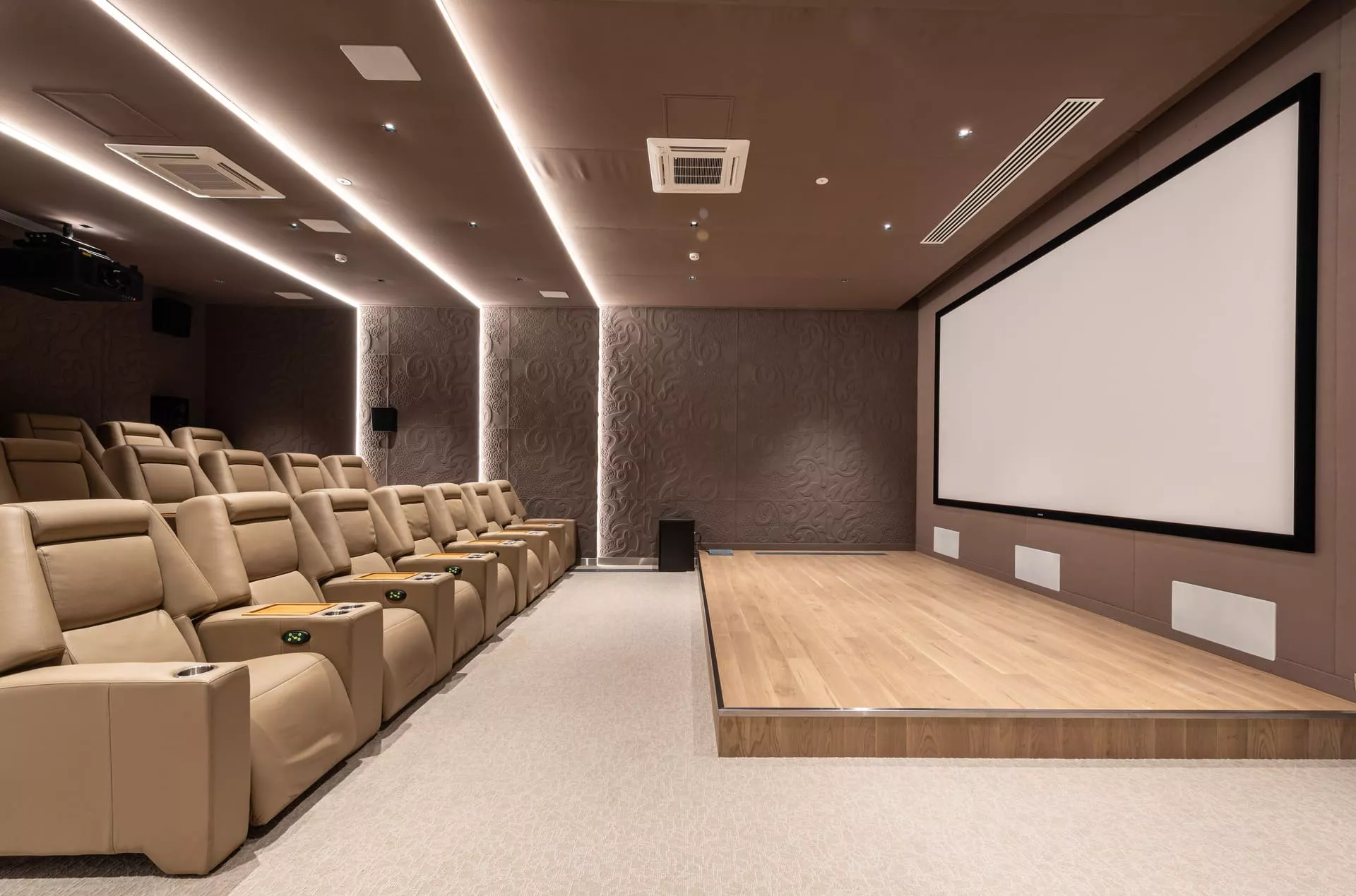 Вашему вниманию премиальный кинозал для настоящих любителей комфорта. Кожаные кресла, как в салоне первого класса авиалайнера, регулируемое освещение и система климат-контроля создают максимальное удобство для зрителей.